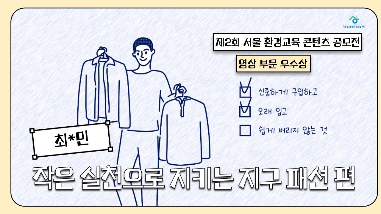 「2025년 제2회 서울특별시 환경교육 콘텐츠 공모전」 영상 부문 수상작○ 시상명 : 우수상(서울특별시환경교육센터장상) 수상작○ 작품명 : 작은 실천으로 지키는 지구 패션 편○ 팀 명 : 최병민✔ 해당 영상의 저작…